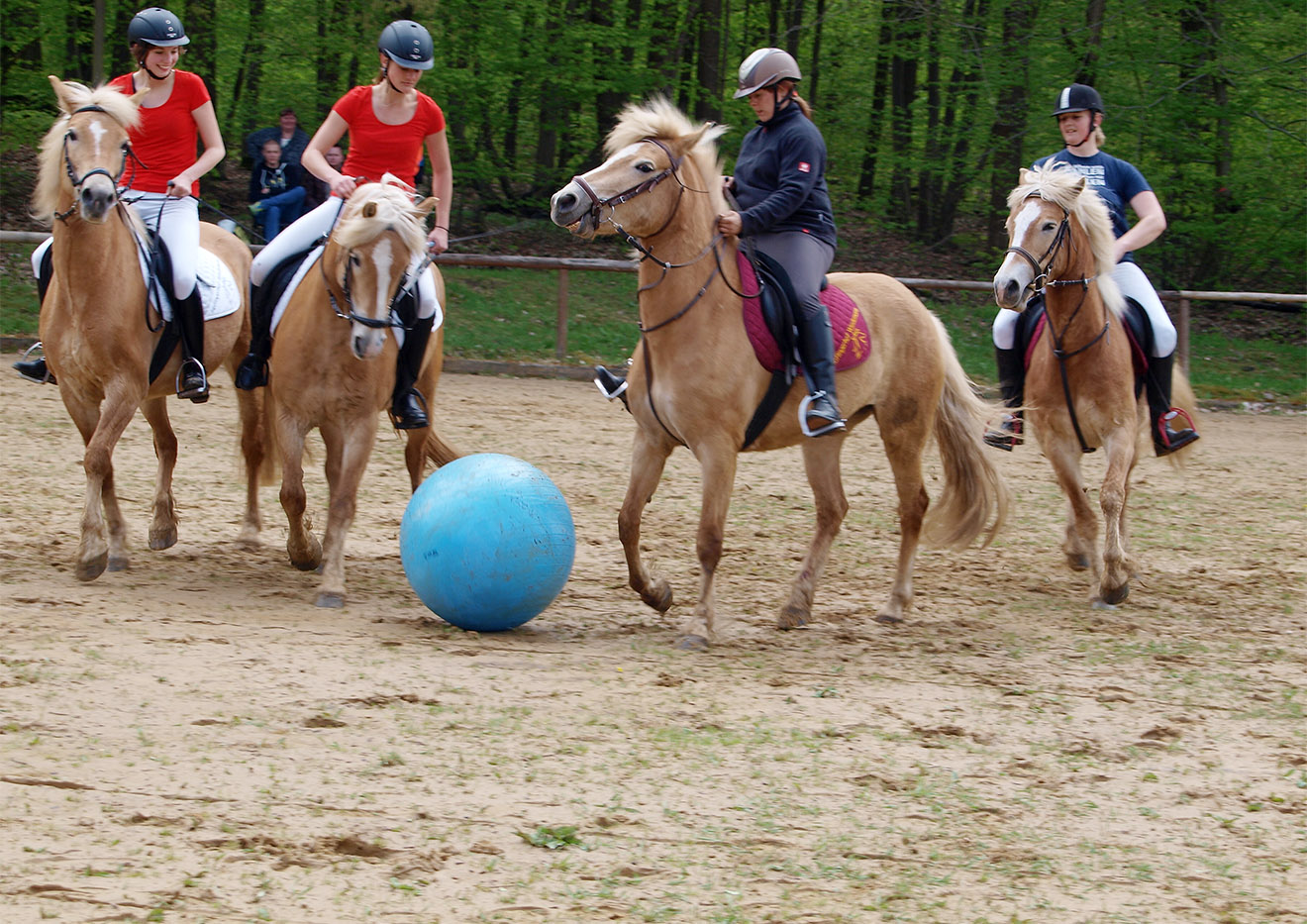 Im Showprogramm auf dem Reitplatz des Gestüt Bretmühle war eine große Breite der Pferderassen zu erleben, angefangen beim Schweren Warmblut, über das Deutsche Reit- und Fahrpferd, das Kaltblut, die Haflinger und die Pony, unter ihnen die so seltenen Exmoorpony ( eine sehr zähe englische Ponyrasse ). Zwei Pony am langen Zügel vom reiterlichen Nachwuchs des RFV Gestüt Bretmühle e.V. geführt, eröffneten den reiterlichen Nachmittag, gefolgt von einer Reiterquadrille der jungen Damen des Vereins. Bettina Winkler ließ es sich nicht nehmen, mit der eingespannten Stute „Anni“ ihre Siegerschärpe des Bundeschampionats 2014 auf dem Kutschbock zu präsentieren. Interessant für die Besucher und Gäste – Bettina Winkler wird 2015 mit der Stute „Anni“ in Ungarn um die Weltmeisterkrone im Einspännerfahren kämpfen. Ein Gaudi der besonderen Art war das Pferdefußballspiel zweier Mannschaften, das Geschick aber auch Durchsetzungsvermögen von Pferd und Reiter verlangte. Toll das Kaltblutgespann, gefahren von Detlef Rahnfeld vom RFV Mohlsdorf e.V. Natürlich waren auch die Gespanne des Gestüts Bretmühle mit von der Partie. Fünf Einspänner mit unterschiedlichen Anspannungen sowie Kutschen präsentierten die Rasanz und die Eleganz des Fahrsports. Unter den Fahrern auch Carolin Sagan, die Thüringer Jugendmeisterin im Gespannfahren und dreifache Starterin bei Deutschen Jugendmeisterschaften, die im Gestüt Bretmühle eine Ausbildung absolviert. Ein Pas de Deux mit zwei Pferden, geritten vom reiterlichen Nachwuchs des RFV Gestüt Bretmühle e.V., zeigte noch einmal die Eleganz des Reitens sowie die enge Verbindung von Pferd und Reiter, und das in allen drei Grundgangarten. Und das wurde dann noch deutlicher, als Rebecca Hofmann im Damensattel eine Dressurvorführung zeigte. Einseitig auf dem Pferd sitzend und mit entsprechendem Schenkeldruck das Pferd führen, das verlangt schon viel reiterliches Können von der Reiterin. Reiterspiele mit zwei Haflingern und eine Reitquadrille mit den vier Exmoorpony aus Zeulenroda rundeten das Programm auf dem Reitplatz im Gestüt Bretmühle ab. Höhepunkt dieses pferdesportlichen Nachmittags war dann, wie in den vergangenen Jahren auch, die Fohlentaufe der drei Neugebohrenen des Gestüts. Das Stutfohlen von „Nebraska“ wurde auf den Namen „Noble Lady“, das Hengstfohlen von „Noble Princes“ auf den Namen „River Boy“ und das Stutfohlen von „Adelheid“ auf den Namen „Arizona“ getauft, wobei die drei Fohlen mit den Sektspritzern nichts richtiges anfangen konnten. Doch ihre Rasse und Klasse zeigten sie bereits jetzt bei der Vorstellung mit ihren Müttern, was beim Gestüt Bretmühle sowie den Pferdesportfreunden große Hoffnungen wachsen lässt.