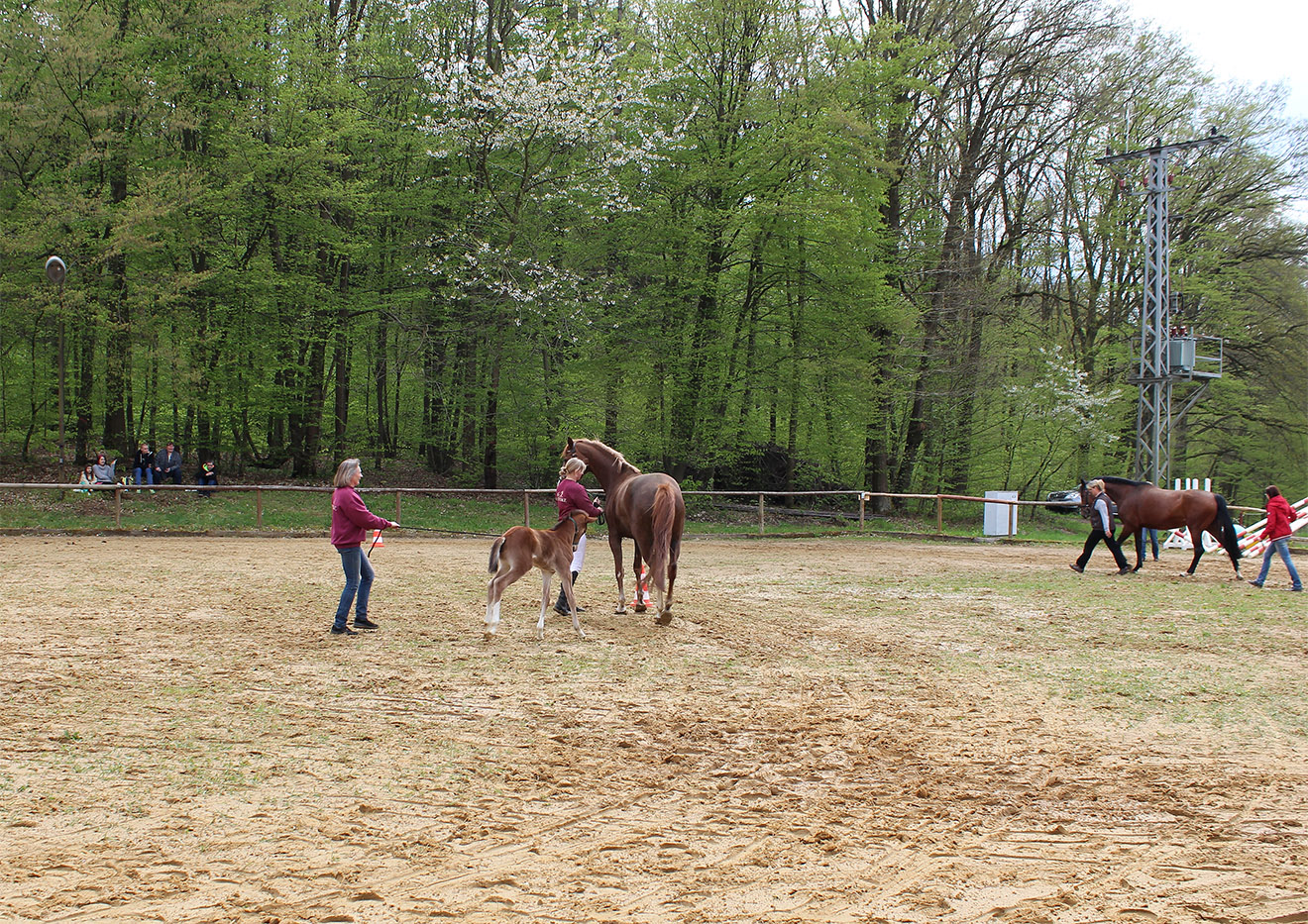 Stute und Fohlen gefällt es sichtlich herumzutollen.