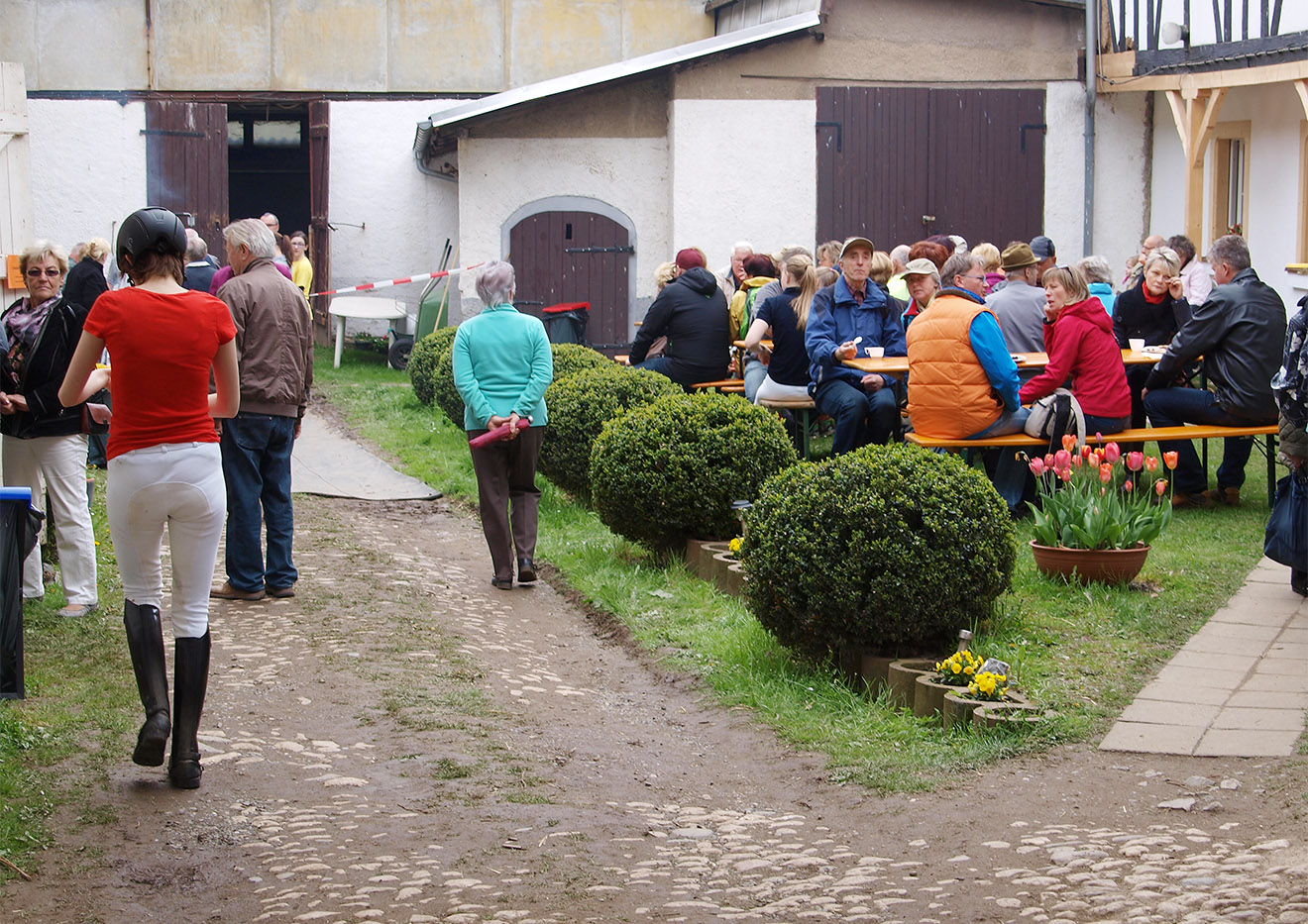 Im Hof des Gestüts Bretmühle haben es sich die Gäste gemütlich gemacht.