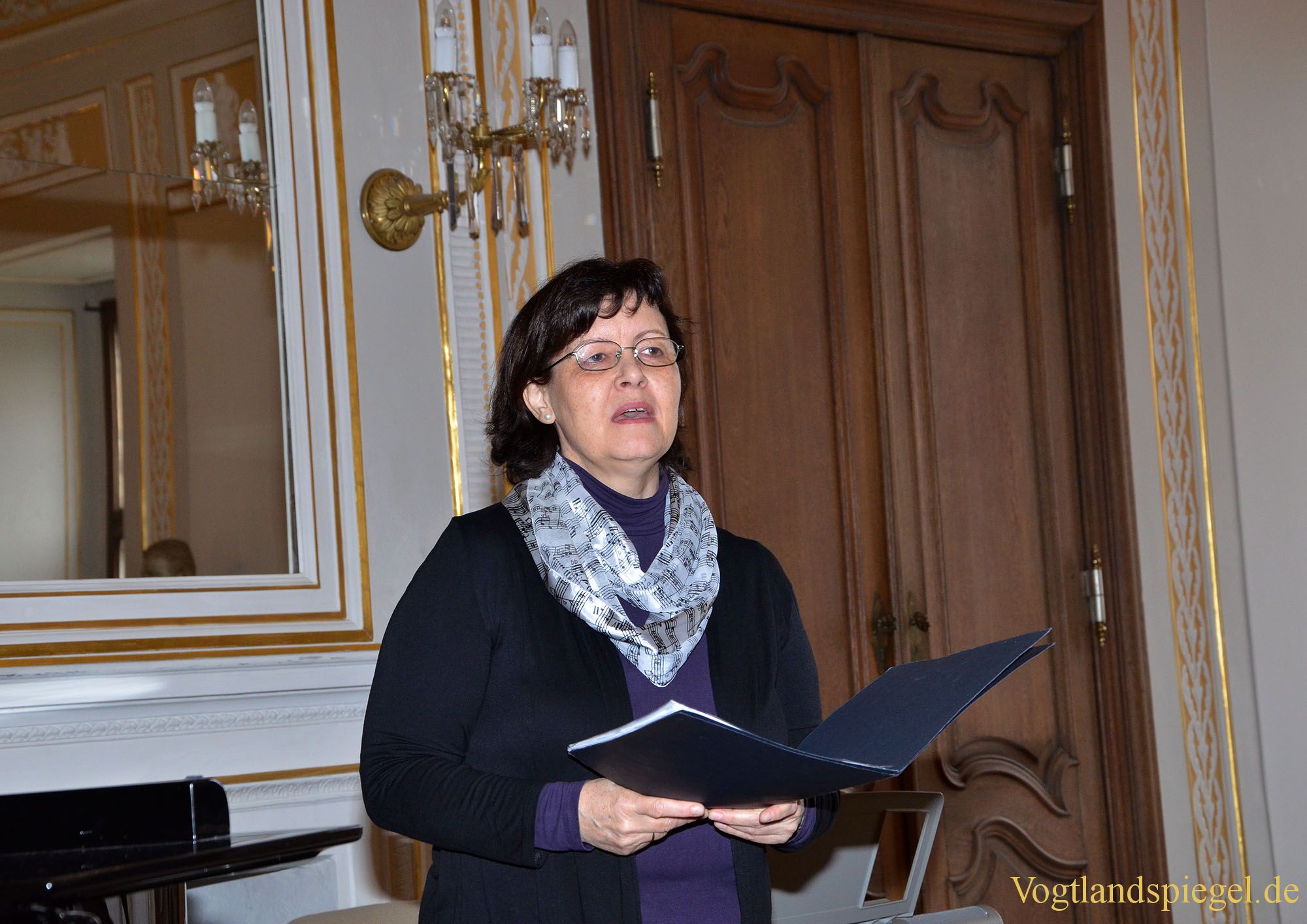Musikpädagogin Cirsten Wetzel begrüßt die Gäste im Weißen Saal.