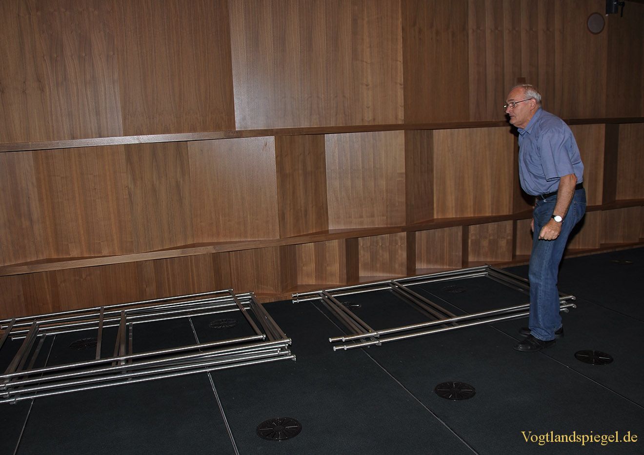 Die Gestelle für die Tische werden von Konrad Wiedmann in Augenschein genommen.