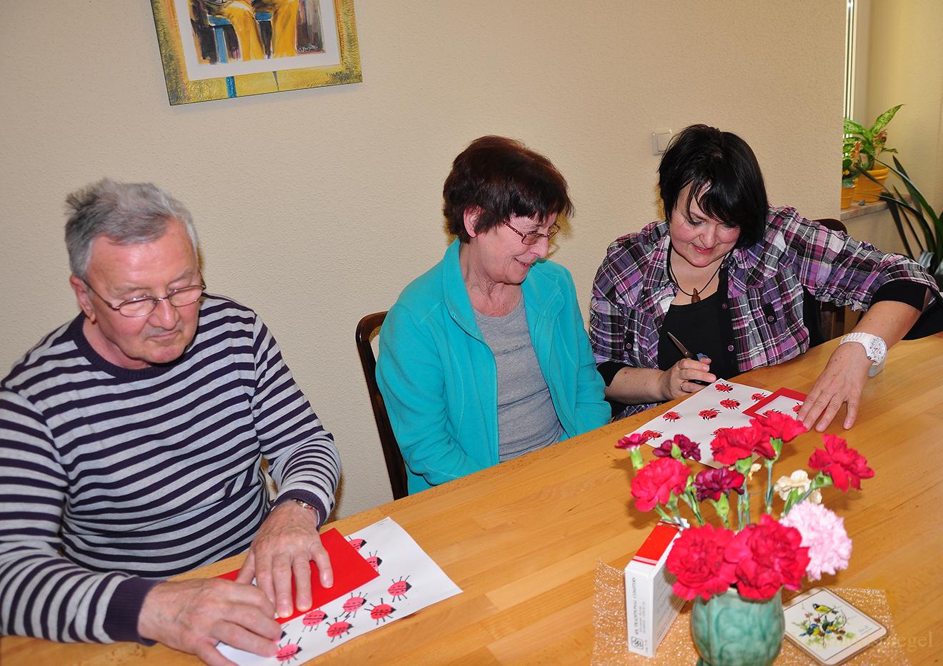 Bärbel Leder (r.) gibt freundliche Tipps zur Gestaltung der Osterkarte.