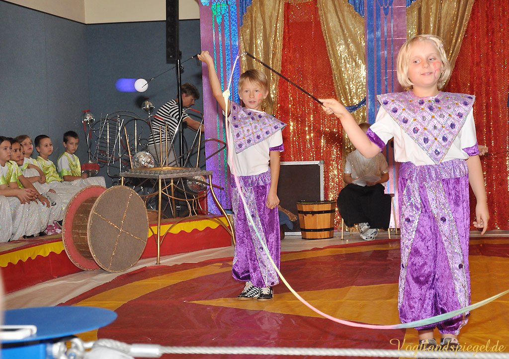 Ich sah das Programm an einer anderen Grundschule und war total gefesselt, wie Schulleiterin Karina Feustel gestand. Besonders wichtig erachtete sie, dass auch geistig und körperlich behinderte Kinder in das Geschehen integriert wurden. Es waren vier spannende Tage, die auch ein wenig aufregend waren. Wo sollte der Fuhrpark samt Wohnwagen des Zirkus“ stationiert werden? In Frank Böttger, Geschäftsführer der Greizer Freizeit-und Dienstleistungs GmbH fand sie beste Unterstützung, betonte Frau Feustel, die sich dafür noch einmal herzlich bedankt: Im Aubachtaler Sommerbad konnte die Wagenburg für diese Zeit ihr Domizil beziehen. Auch an die Lehrkräfte der Schule und den Förderverein, der finanziell hälftig das Projekt trug, ergeht der Dank der Schulleiterin.