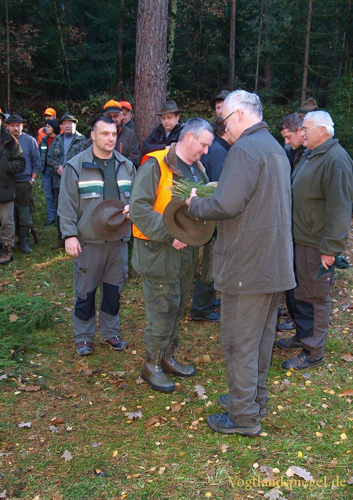 Karsten Schröder (2.v.r.), Forstamtsleiter des Thüringer Forstamt Weida, dankte allen Jägern und Treibern.