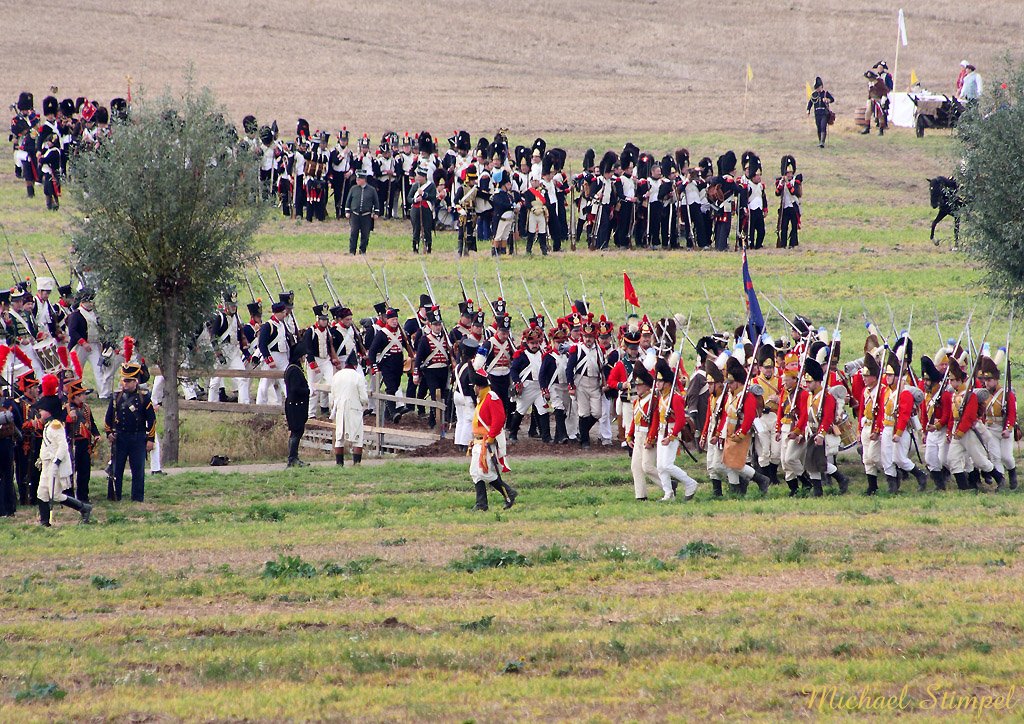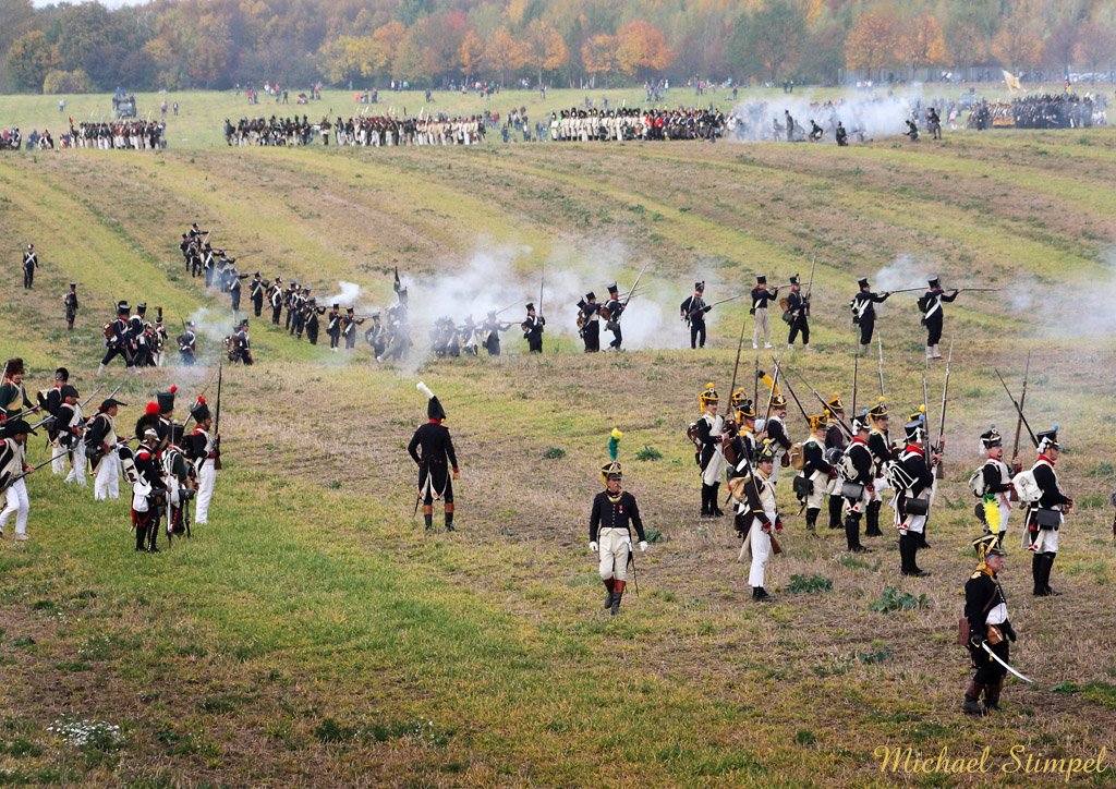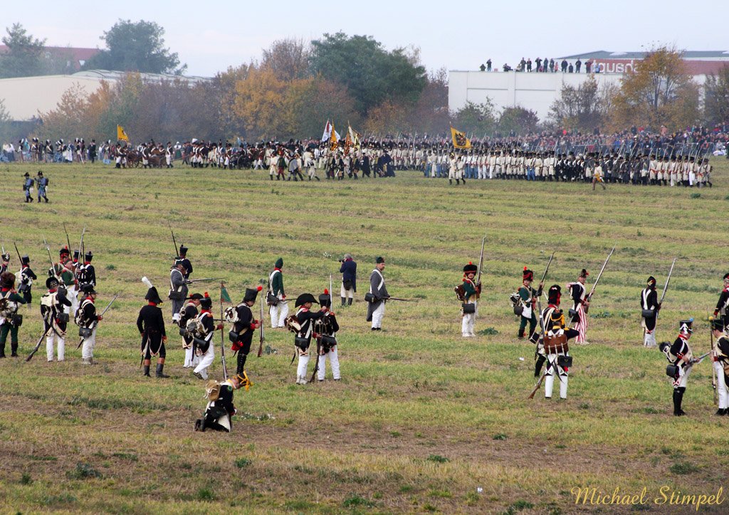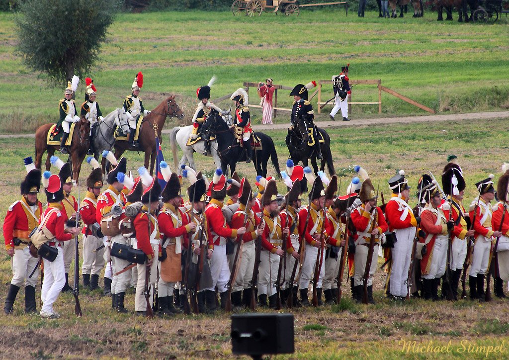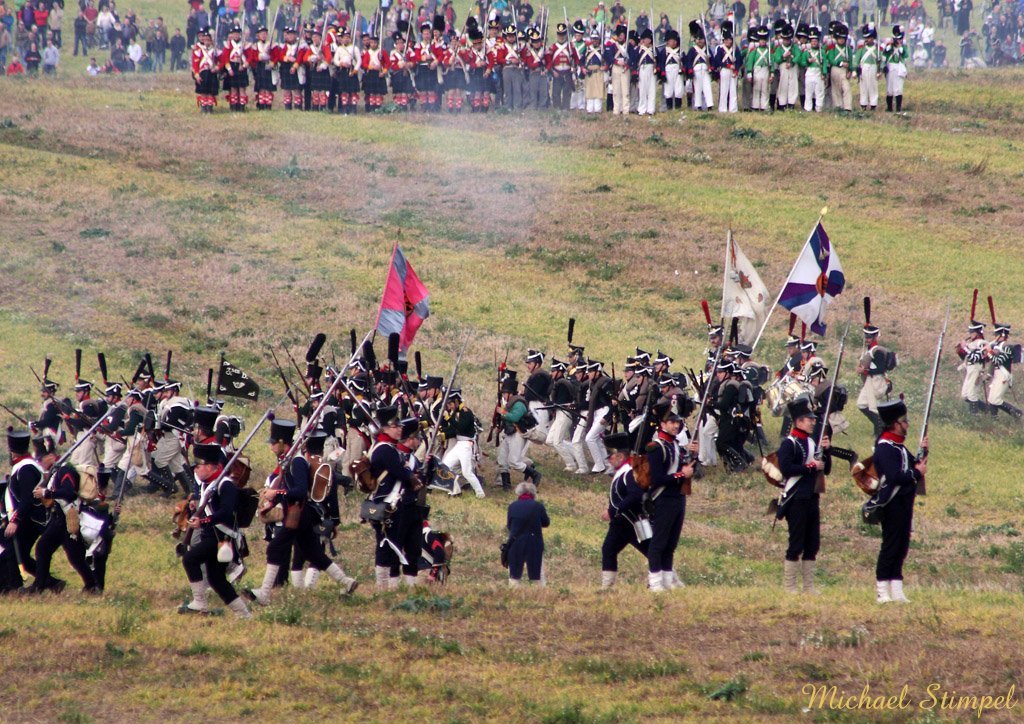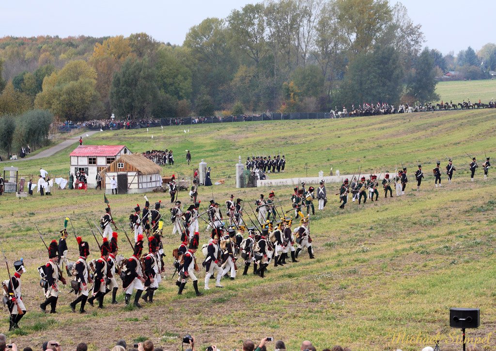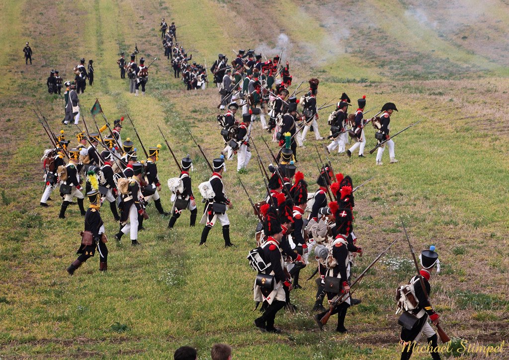 Die meisten „Freizeitsoldaten“ hatten in Biwaks campiert, wo sie zum Teil ihre Speisen am offenen Feuer zubereiteten. In langen Kolonnen waren sie zum Gefechtsfeld marschiert, auch Kanonen wurden in die Weinteichsenke geschleppt. Auf etwa 250 Pferden galoppierten Kavalleristen über das Feld.