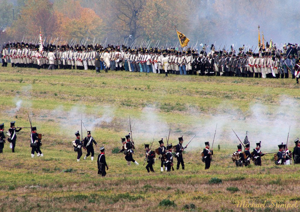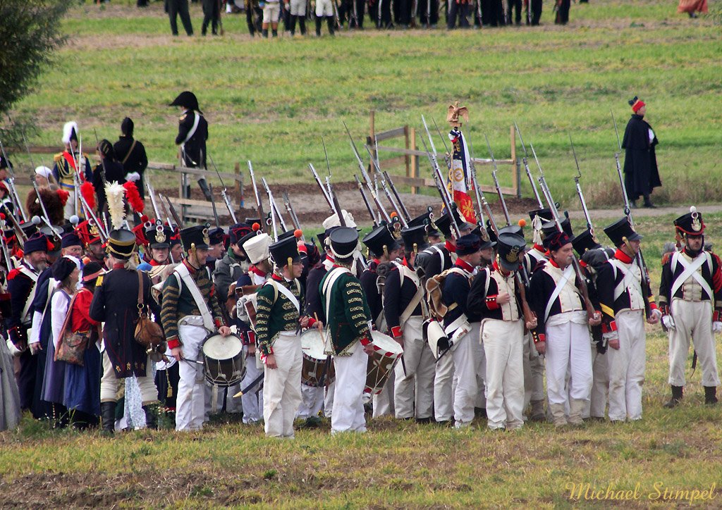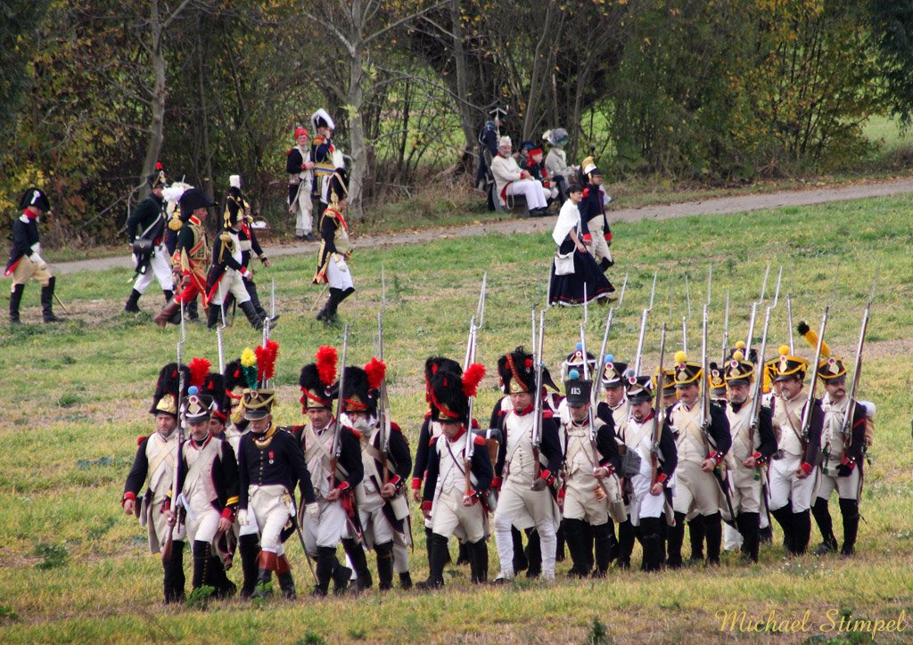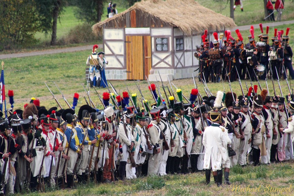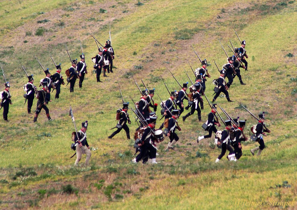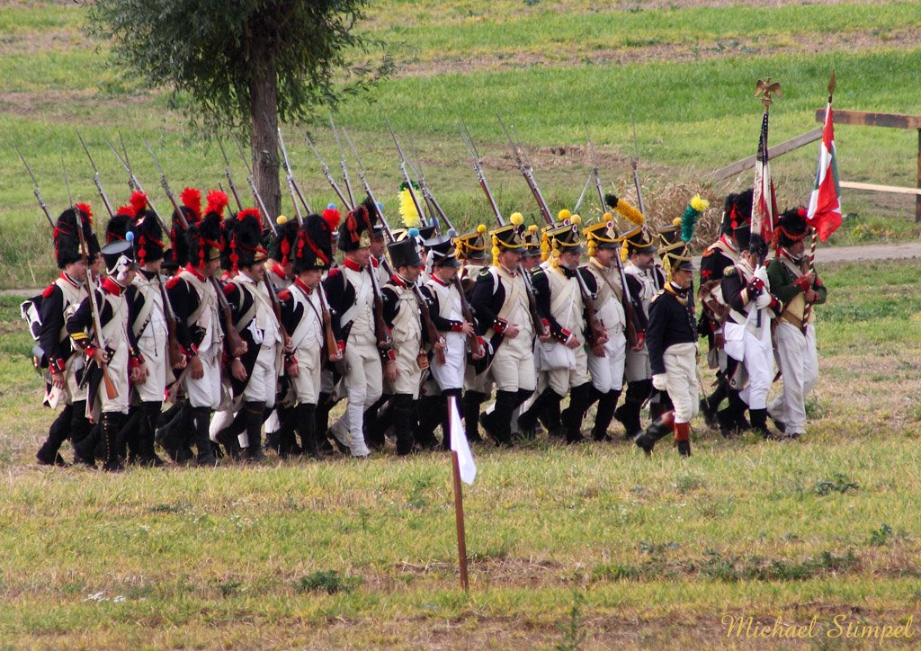 Die meisten „Freizeitsoldaten“ hatten in Biwaks campiert, wo sie zum Teil ihre Speisen am offenen Feuer zubereiteten. In langen Kolonnen waren sie zum Gefechtsfeld marschiert, auch Kanonen wurden in die Weinteichsenke geschleppt. Auf etwa 250 Pferden galoppierten Kavalleristen über das Feld.