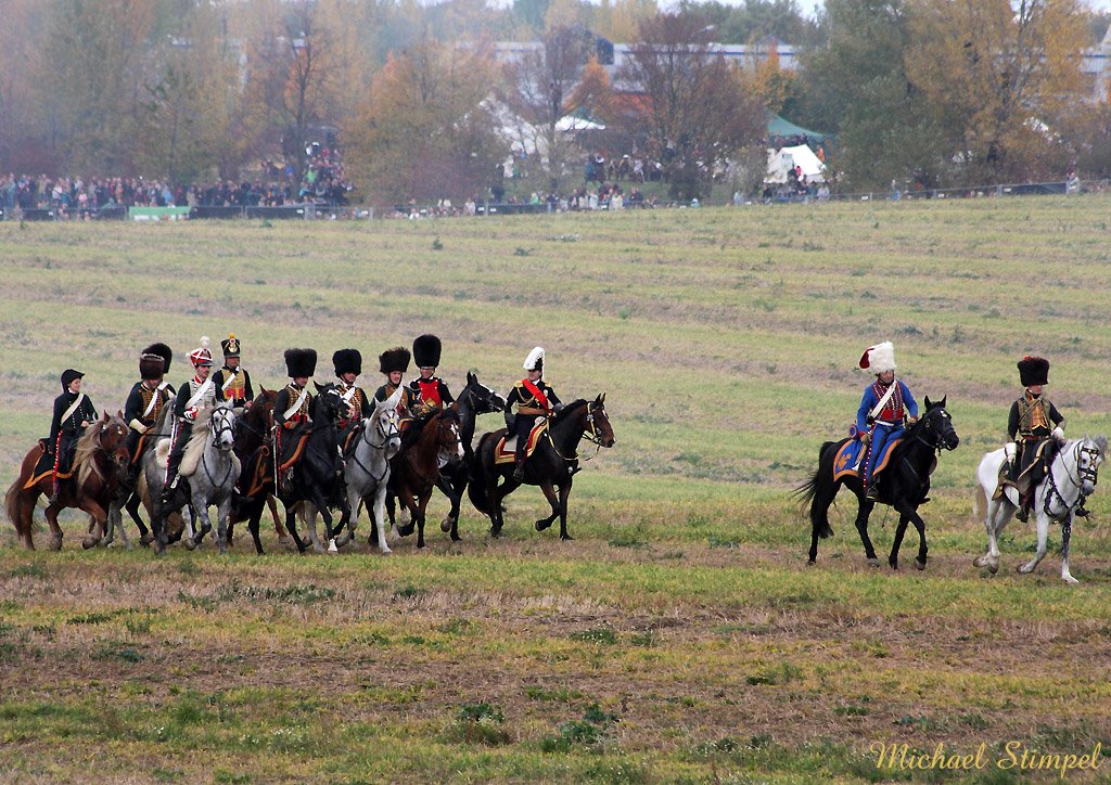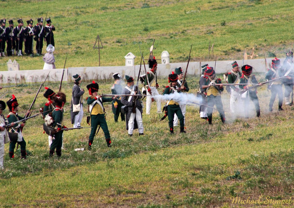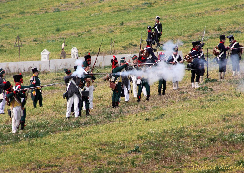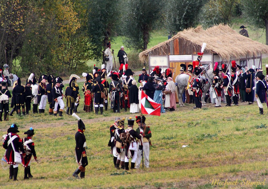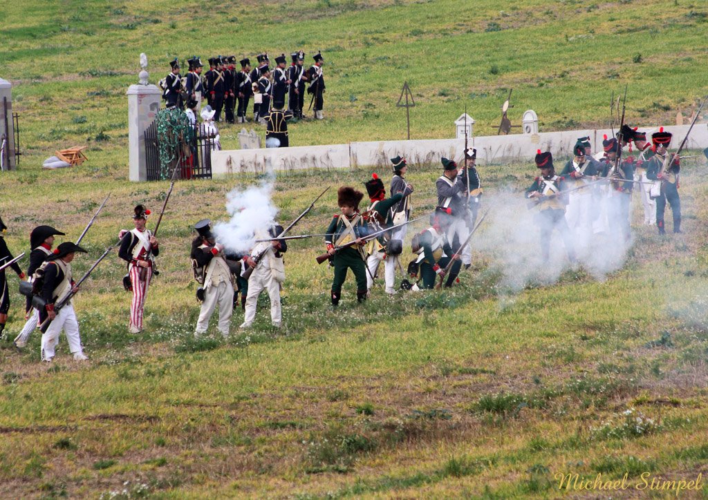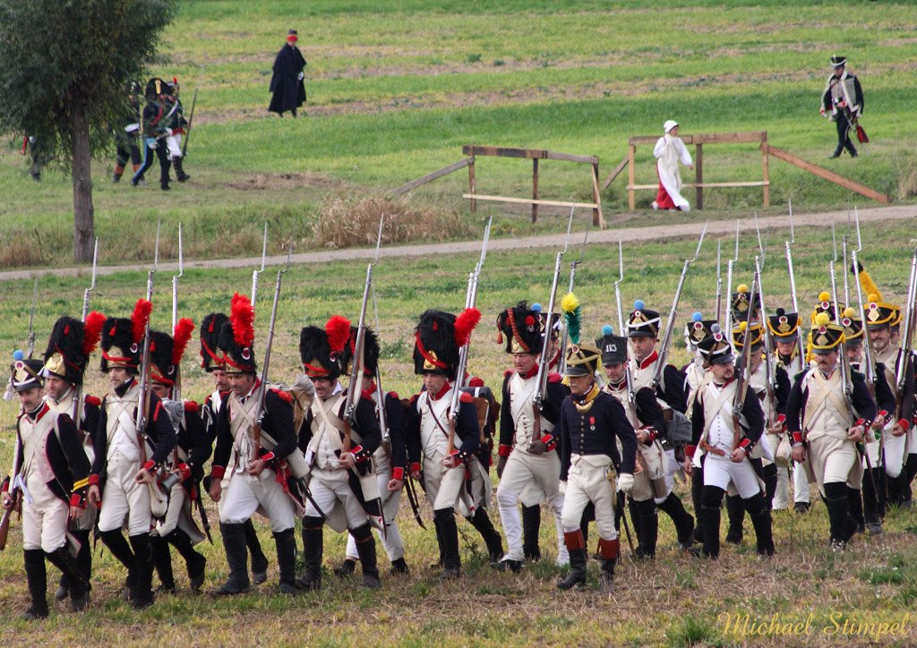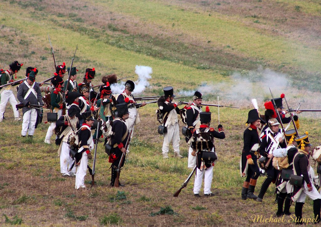 Die meisten „Freizeitsoldaten“ hatten in Biwaks campiert, wo sie zum Teil ihre Speisen am offenen Feuer zubereiteten. In langen Kolonnen waren sie zum Gefechtsfeld marschiert, auch Kanonen wurden in die Weinteichsenke geschleppt. Auf etwa 250 Pferden galoppierten Kavalleristen über das Feld.