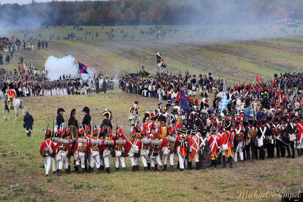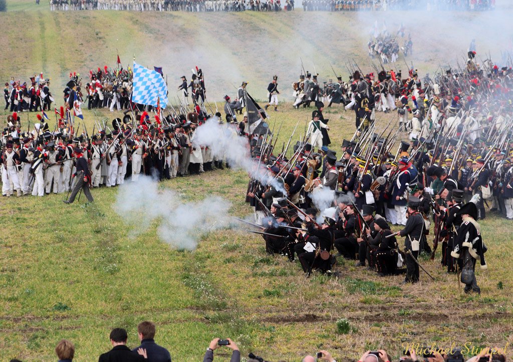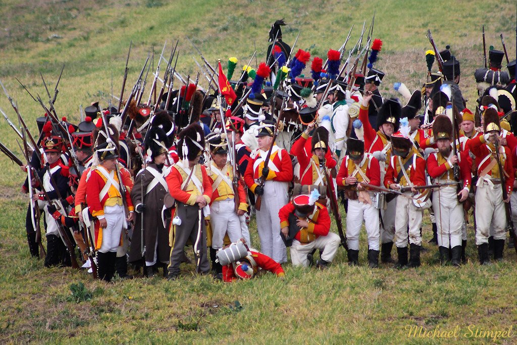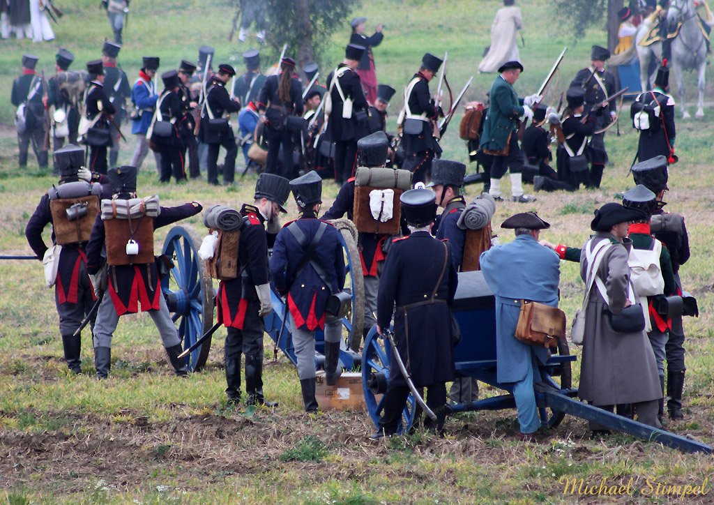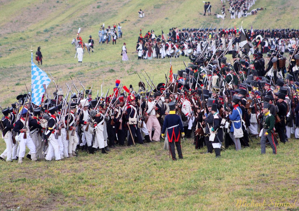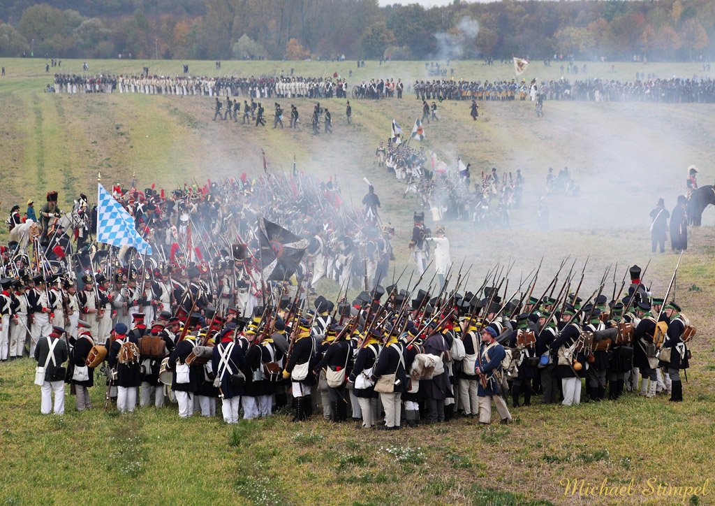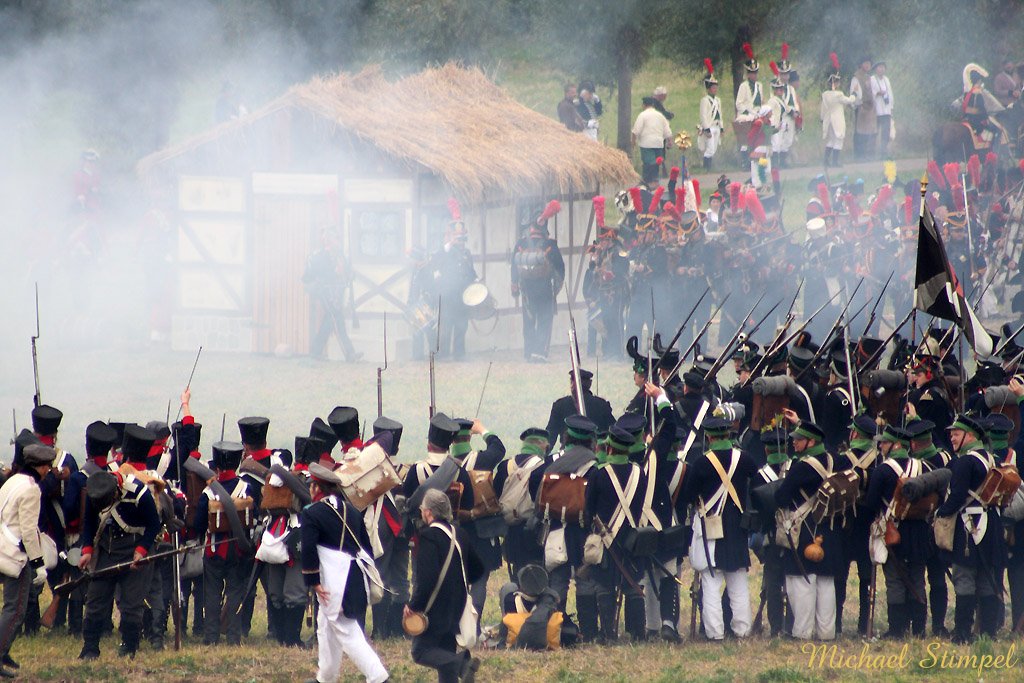 Die meisten „Freizeitsoldaten“ hatten in Biwaks campiert, wo sie zum Teil ihre Speisen am offenen Feuer zubereiteten. In langen Kolonnen waren sie zum Gefechtsfeld marschiert, auch Kanonen wurden in die Weinteichsenke geschleppt. Auf etwa 250 Pferden galoppierten Kavalleristen über das Feld.