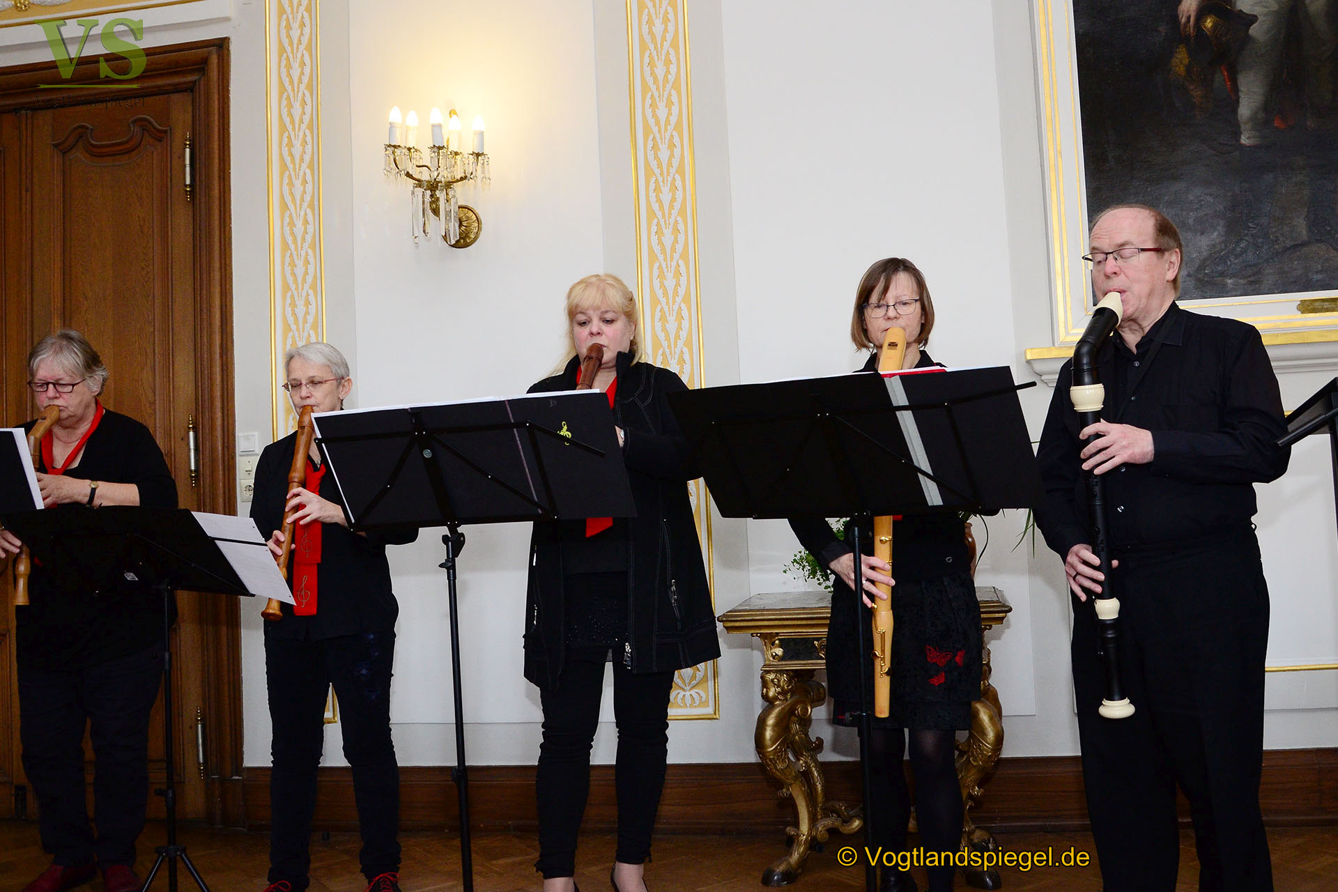 Das Blockflötenensemble „Melange“ unter Leitung von Gretel Töpfer (2.v.r.) konzertiert zur Vernissage.