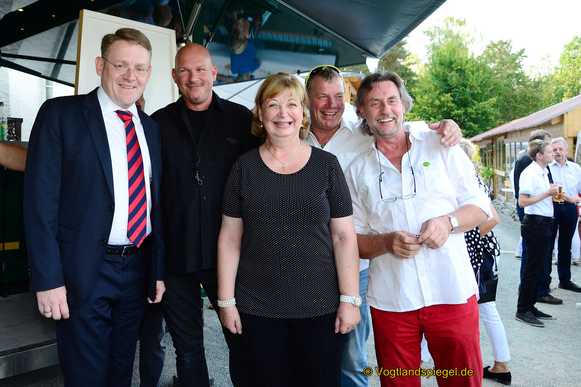 Landrätin Martina Schweinsburg mit Landtagspräsident Christian Carius (l.) und Musikern der Band „Evergreen Frogs“.