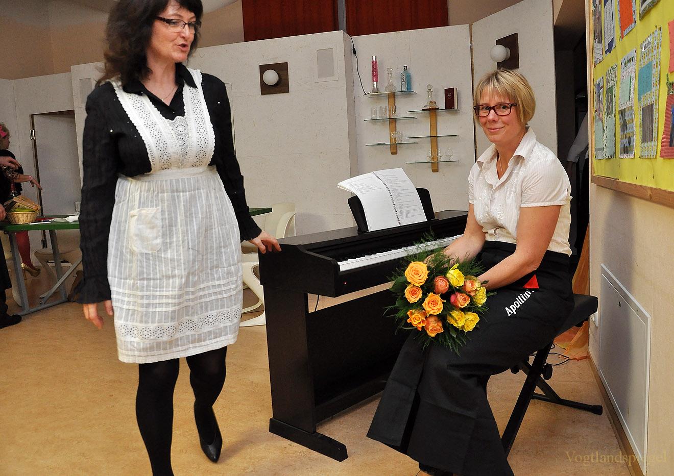 Das Theaterstück „Wo ist Bob?“ wurde vom Verein the.aRter in der Freien Elstertalschule Greiz aufgeführt. Judith Schatz (l.) und Lisa Hohmuth überreichen die Blumen für die Akteure.