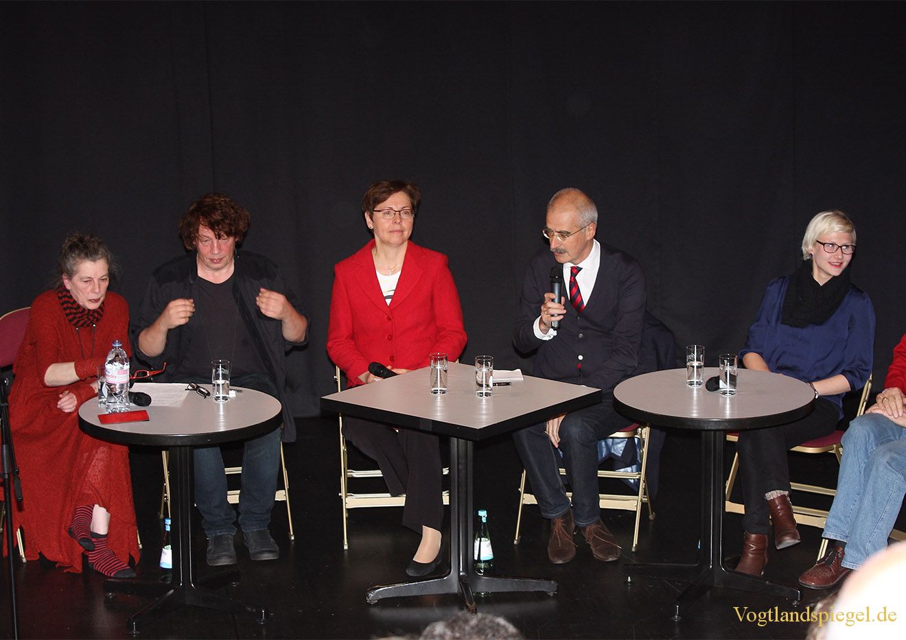 Podiumsdiskussion mit v.l. Bettina Wegner, Karsten Troyke, Heike Taubert, Sergej Lochthofen und Marie-Theres Mayer. Nicht im Bild Pfarrer Roland Geipel.