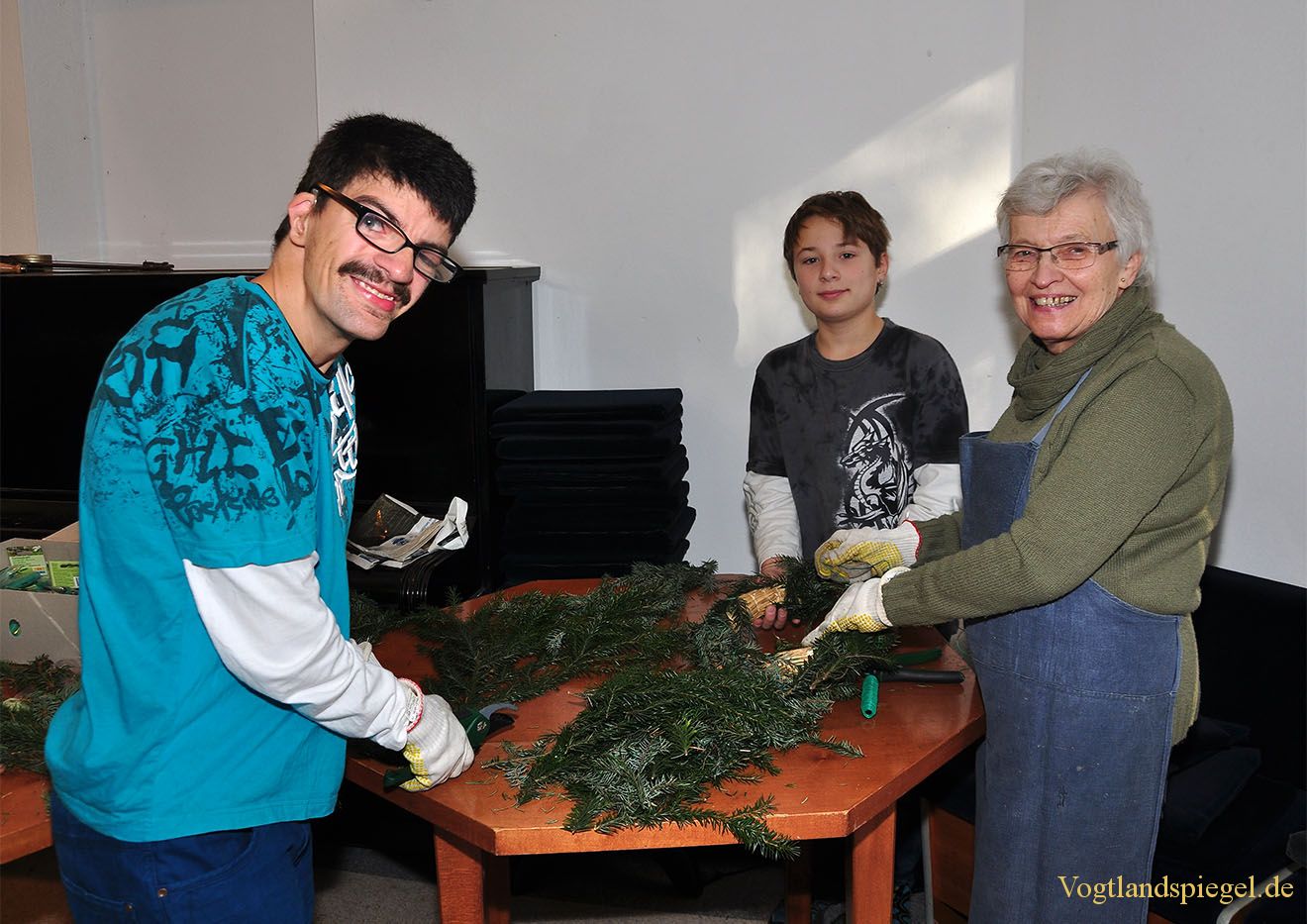 Ingrid Putz und ihre fleißigen Helfer beim Binden von Adeventskränzen.