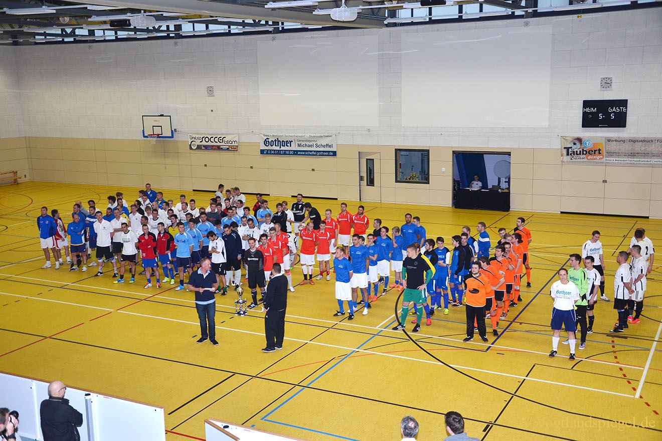Tom Steudel und Philip Wünsch (vorn) begrüßen die Teilnehmer des Weihnachtshallenturniers.