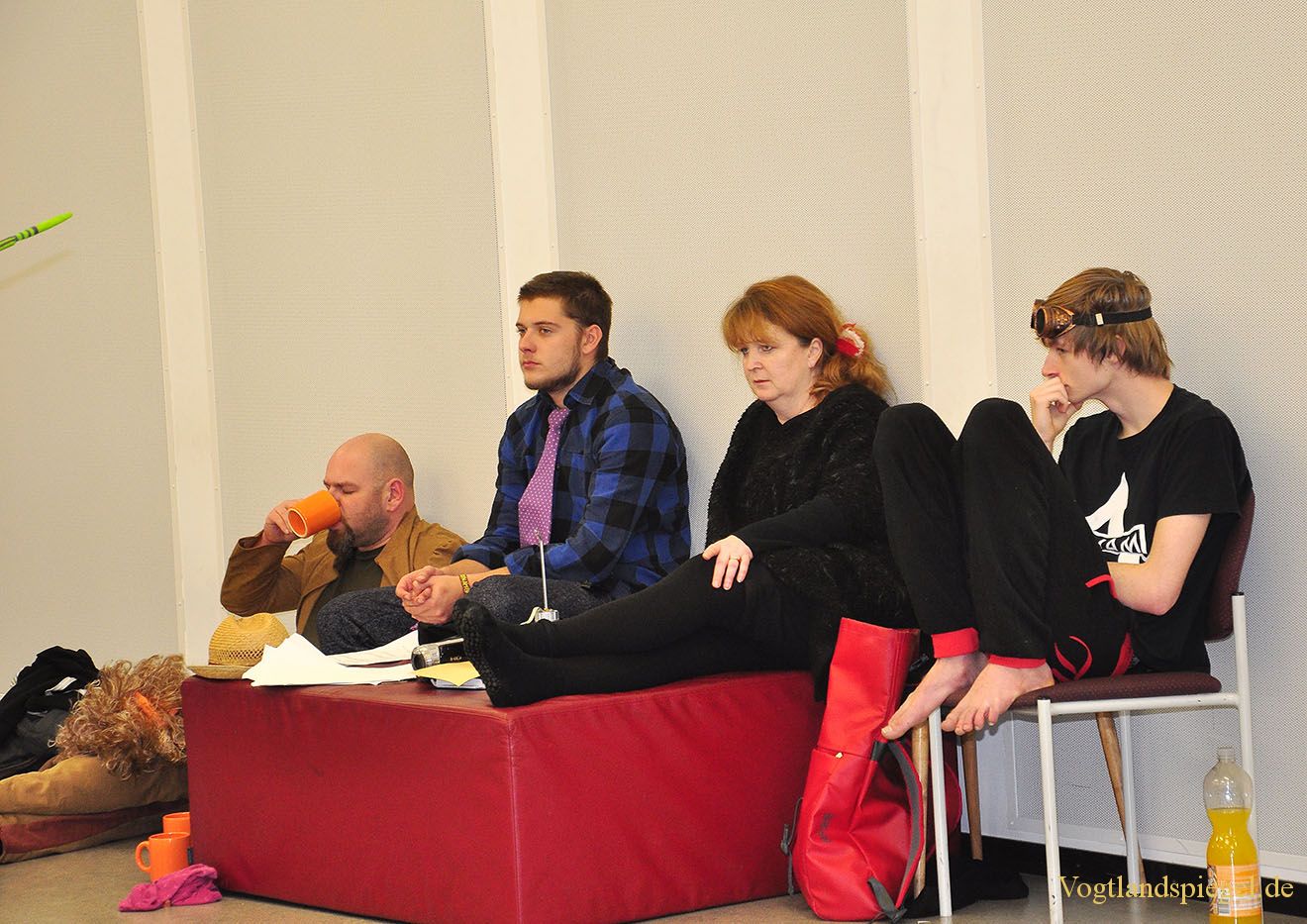 Regisseurin Anke Hartmann (2.v.r.) hört aufmerksam zu.