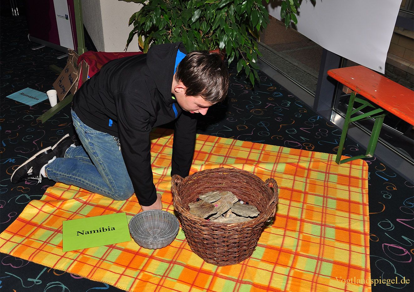 Lucas schaut in die Kiste mit den Steinen aus Namibia.