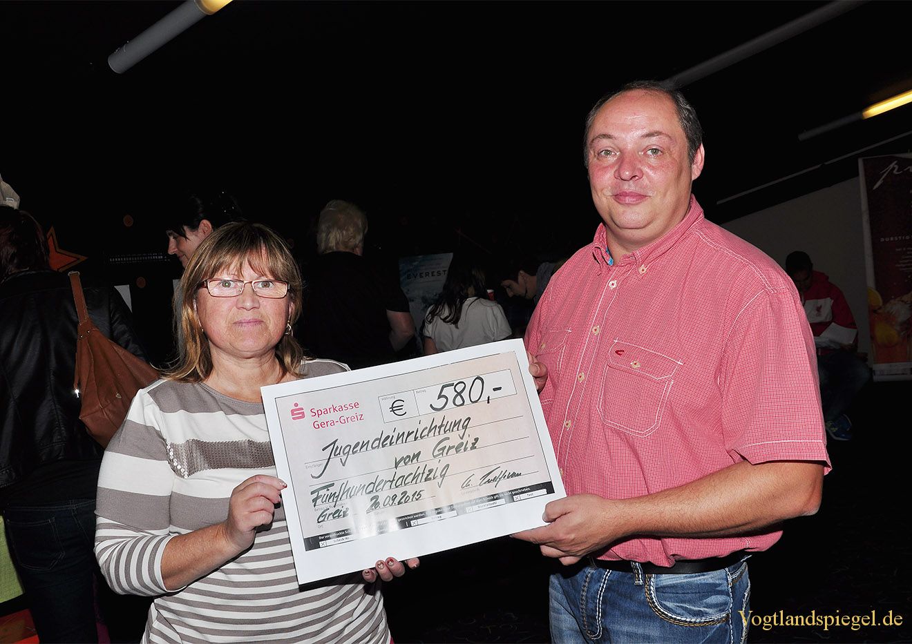 Monika Federer freut sich im Namen der bedachten Jugendeinrichtungen der Stadt Greiz über den Scheck, den ihr Kinoleiter Mario Conrad überreicht.
