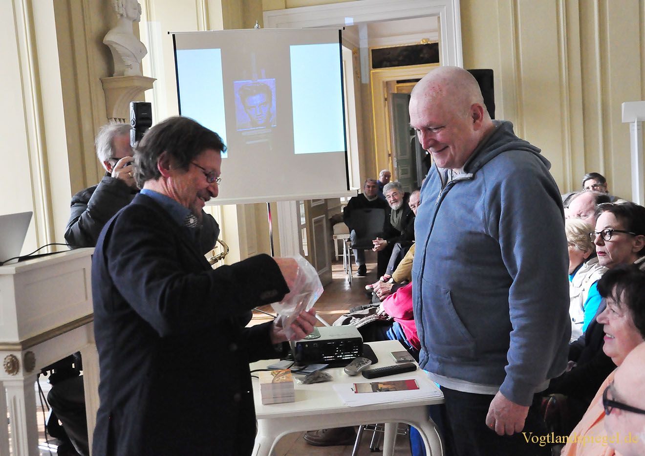 Christoph Wonneberger (l.) hat ein kleines Präsent für Werner David mitgebracht.