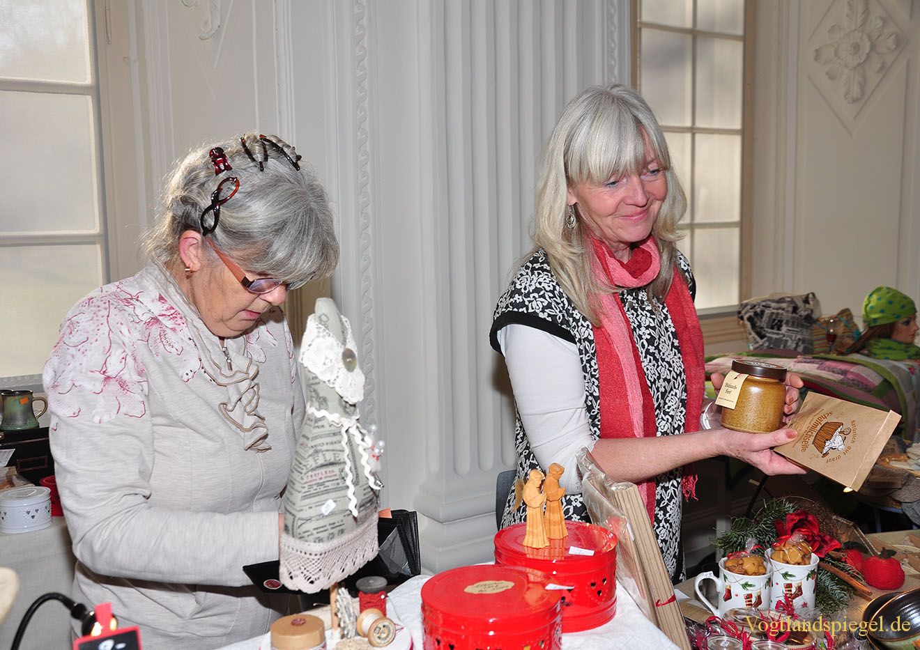 Ines Münzner (r.) vom Museums-und Ferienhof Waltersdorf bietet ihre Ware feil.