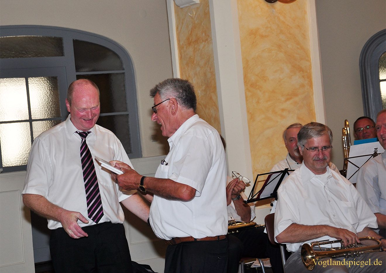 Kantor Ralf Stiller bekommt von Reinhold Weikert (r.) einen Bildband überreicht.